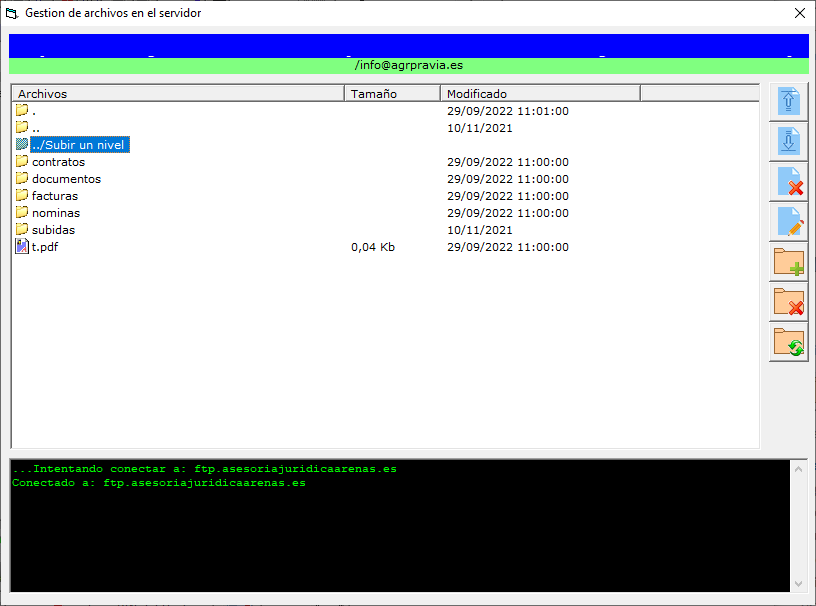 Este botón permite gestionar el almacenamiento en el espacio remoto mediante FTP. Si