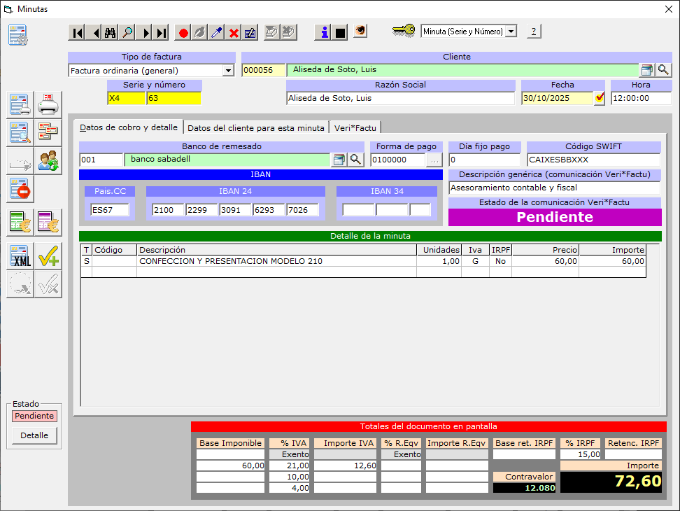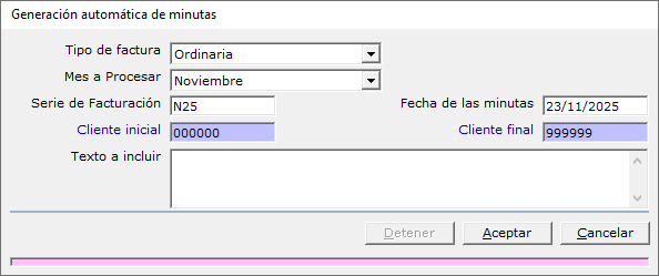 El procedimiento de generación de facturas o minutas ahora añade un campo nuevo en el que tendrá que indicar el tipo de facturación que desea generar