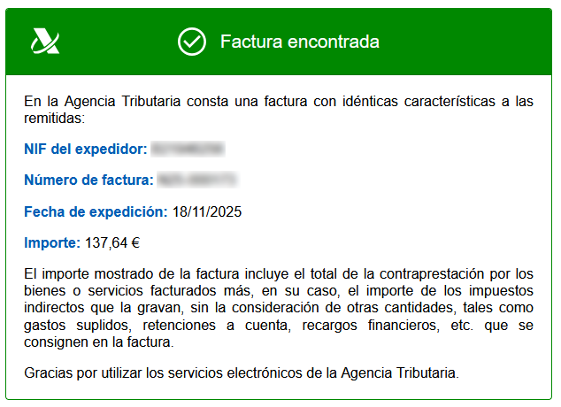 El resultado obtenido es el mismo que se obtiene si se escanea el código QR que se incluye en la factura (o en la pestaña Veri*Factu).