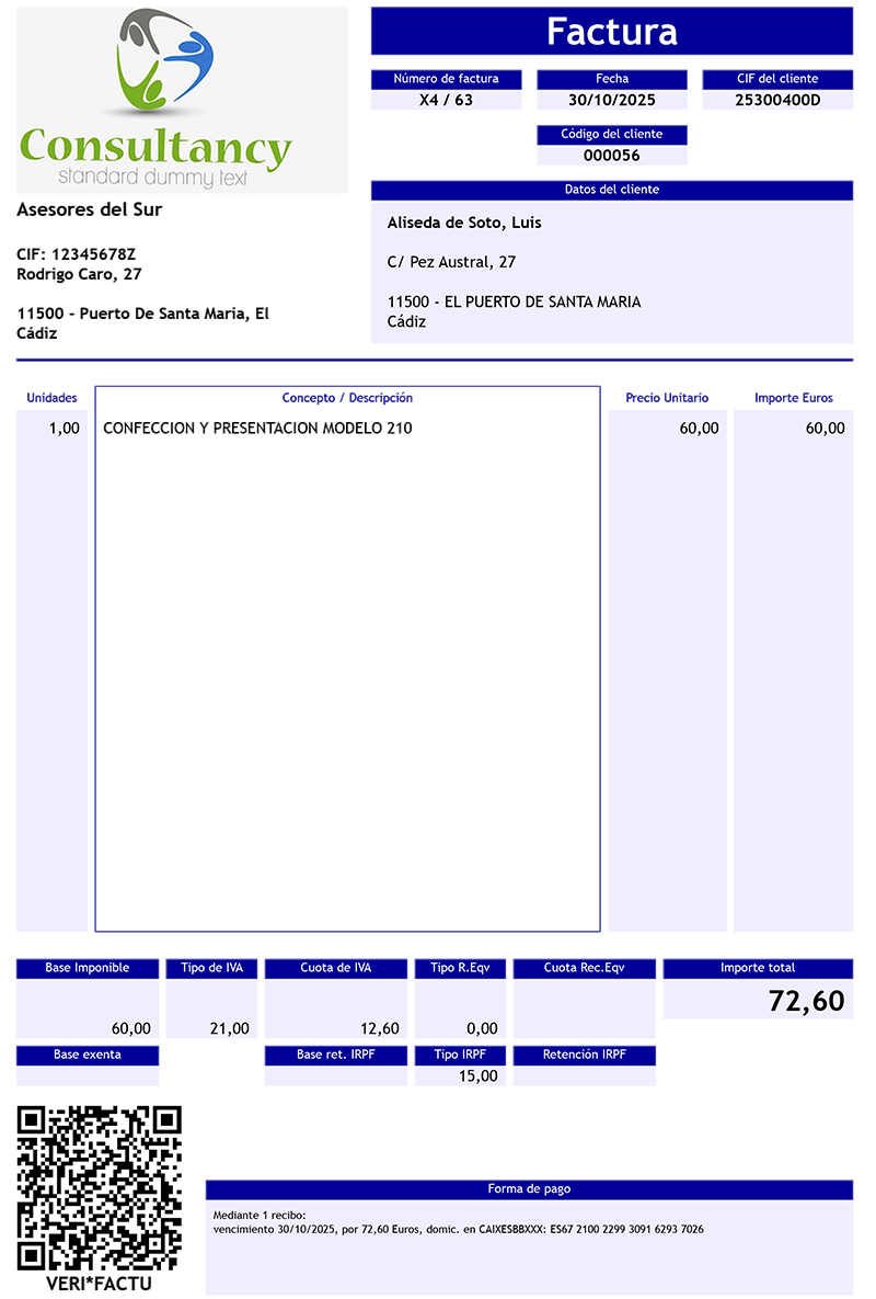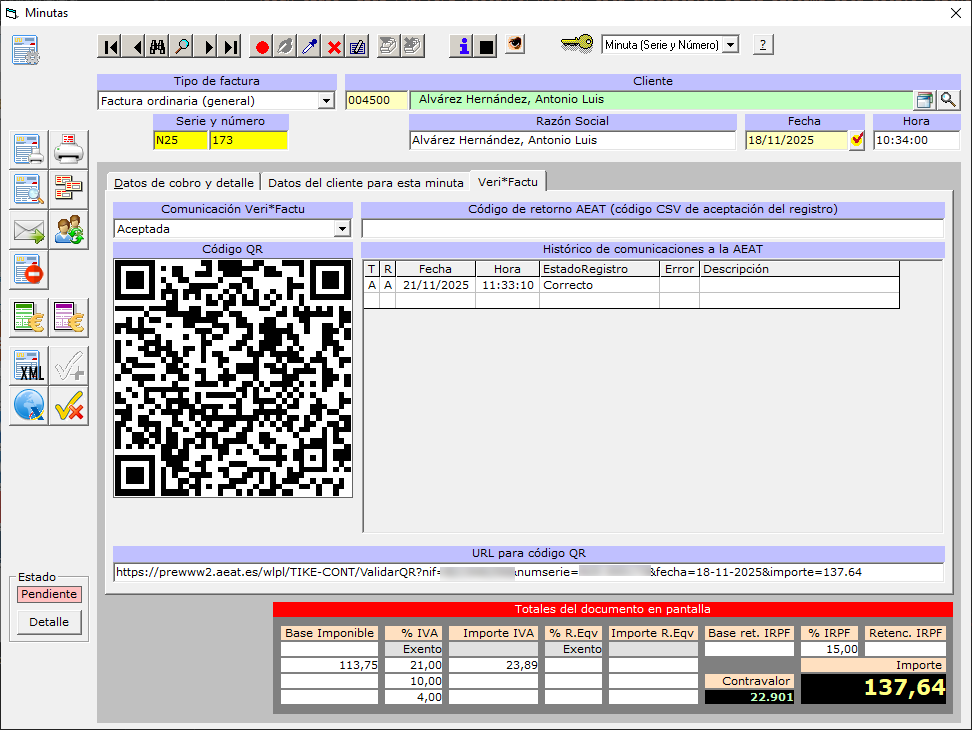 - El código QR para consultar la factura en la web de la AEAT y la URL a la que hace referencia.