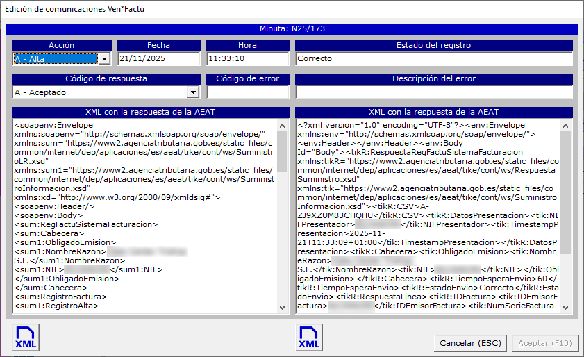 - Un histórico con el resultado de las distintas comunicaciones establecidas con la AEAT para la factura mostrada.