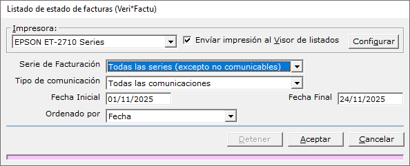 permite obtener un listado con la relación de las facturas solicitadas y su situación con respecto al sistema.
